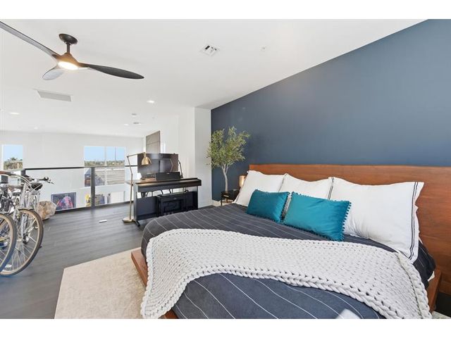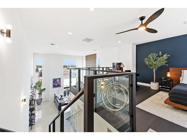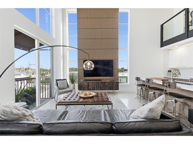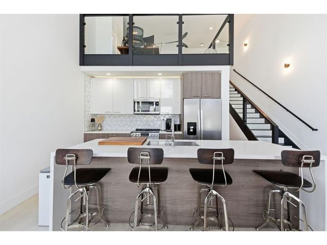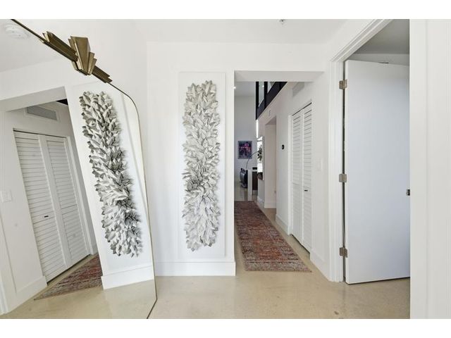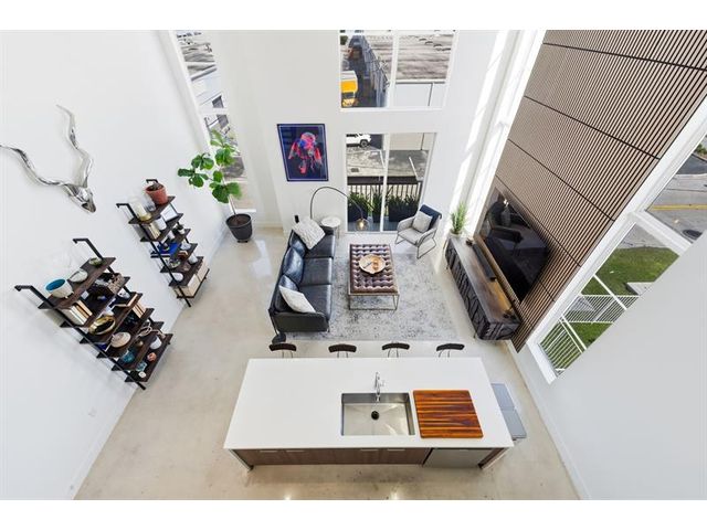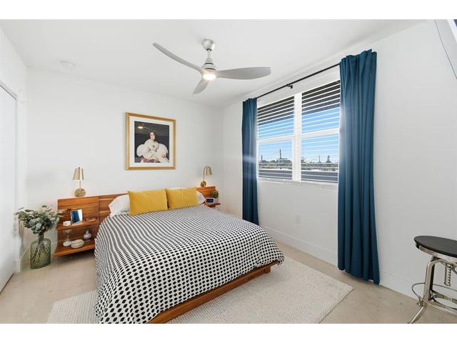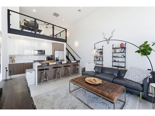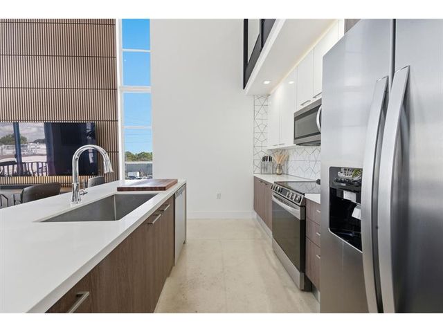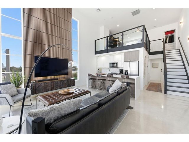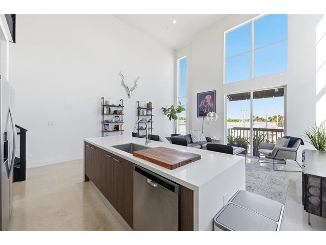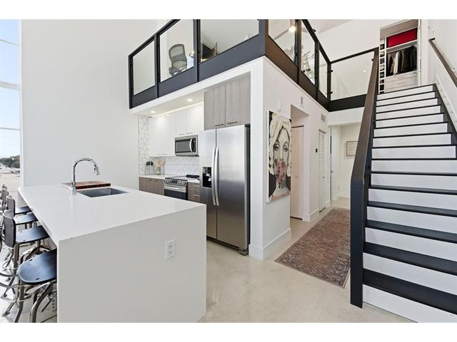 Fall in Love with this designer NYC-style corner loft at URBN Village at 5th Ave, with a low $260/mo HOA. Built in 2020, this 2BR/1BA stuns with 18-ft ceilings, oversized impact windows, & polished concrete floors. The showpiece kitchen features waterfall quartz counters with thicker slab detail, ceiling-height two-tone cabinetry, upgraded backsplash, oversized island, & stainless appliances. A dramatic accent wall, sleek black stairs, & glass railings create a bold, modern vibe. Primary suite offers sleek black LVP floors & a custom closet. Smart switches & thermostat, frameless shower, & resort-style pool. Location is unbeatable! Minutes to Wilton Manors, Federal Hwy, Beach, & the Culinary Arts District. Don't miss this amazing condo!