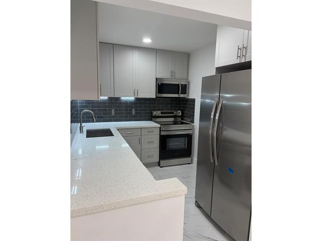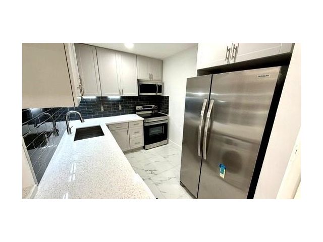 Beautifully remodeled 2-bedroom, 2-bathroom condominium and arguably the finest unit in the community. This residence has been fully updated, with extensive improvements including replacement of the main plumbing lines. The kitchen features new quartz countertops and polished Italian porcelain tile on the walls, offering a modern and elegant finish. New washer and dryer, and all new appliances covered by warranty. Additional upgrades include a new water heater, new air conditioning system, and impact-resistant windows and doors throughout.