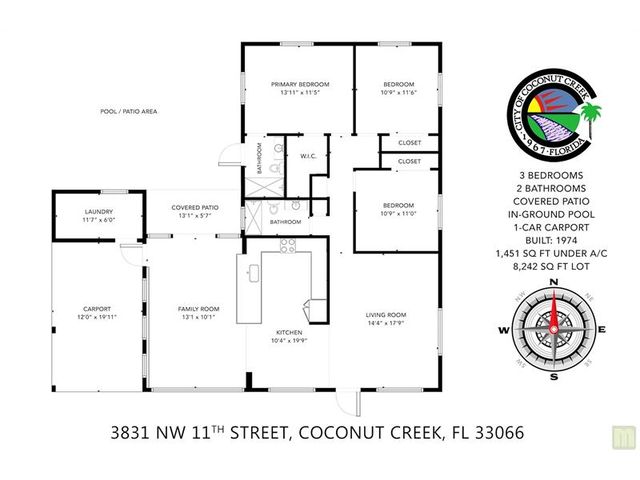 Beautifully renovated home in South Coconut Creek. 3 roomy bedrooms & 2 bathrooms with a private primary en-suite. The kitchen is the heart of any home and it shows with clean white shaker cabinetry, stainless steel appliances, quartz countertops & island seating. Stylish wood-look tile flooring, modern bathrooms featuring glass shower enclosures, & designer tiles. Modern motorized blinds adorn large windows that flood the space with natural light. There's also a brand new, OWNED solar system (50k value) included in the price, 2016 Roof, 2021 A/C, 2024 water heater, updated electrical & more! Enjoy Florida living in a beautiful in-ground pool, covered patio & roomy, fenced yard. yes, you can have it all - and NO HOA!!! Close to schools, shopping, the turnpike & just 7 miles to the beach.